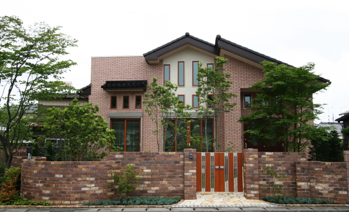 | タイル張りと塗壁で高級感のあるツートンカラーの外観 | 和と洋の調和のとれた家 |